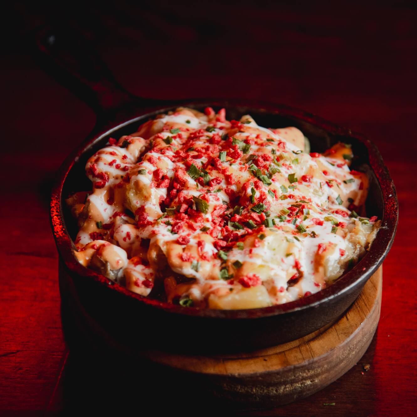 200 gr de papa cortada en cubos revuelta con mantequilla y queso manchego, cubierta de la proteína de tu elección, acompañada de tocino, cebollín deshidratado, media crema y aderezo de mayonesa con chipotle.