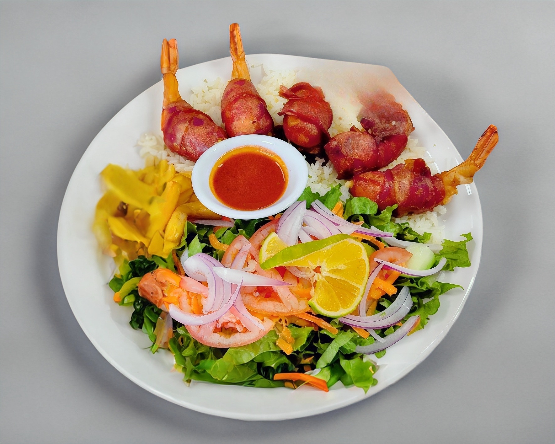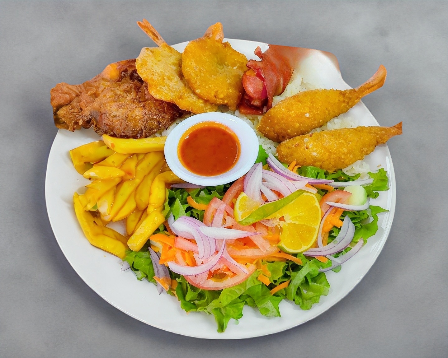 Camaron empanizado, Relleno de Queso, camaron envuelto en Tocino y Camaron al coco