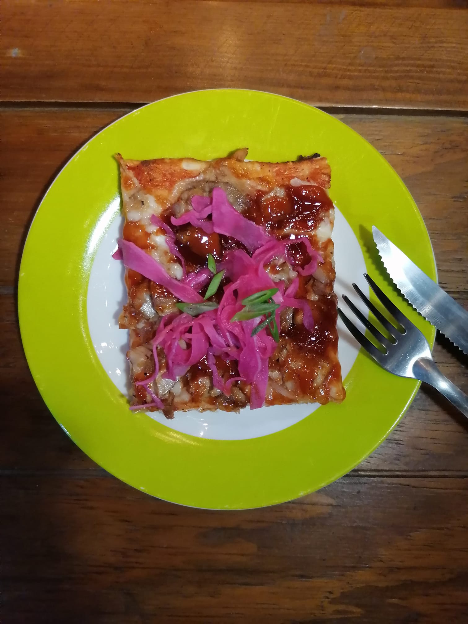 Costilla asada de la casa, cebolla blanca, encurtido de col morada a las especies orientales, queso mozzarella y aderezada con salsa BBQ.