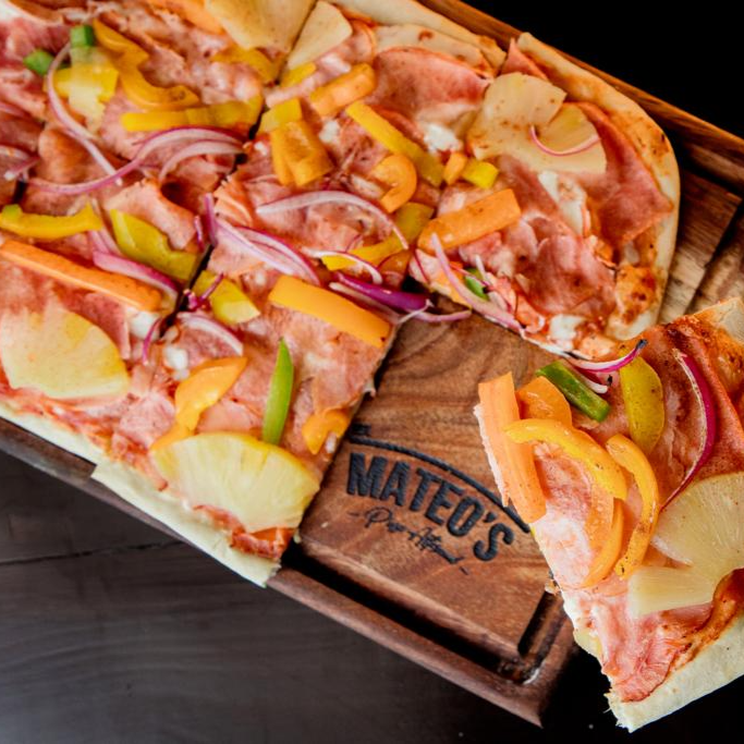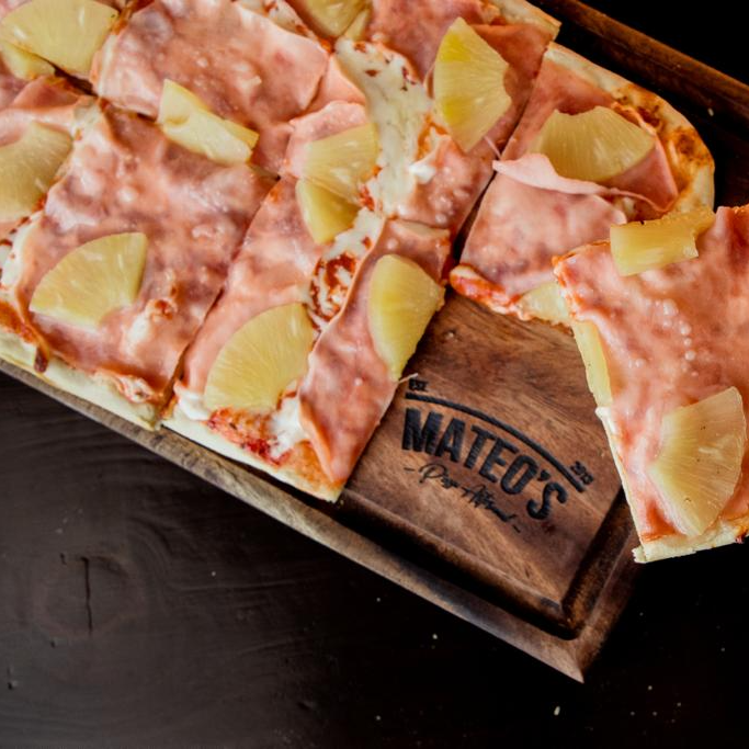 Chuleta ahumada, pimientos, cebolla morada, piña a la canela y mozzarella.
