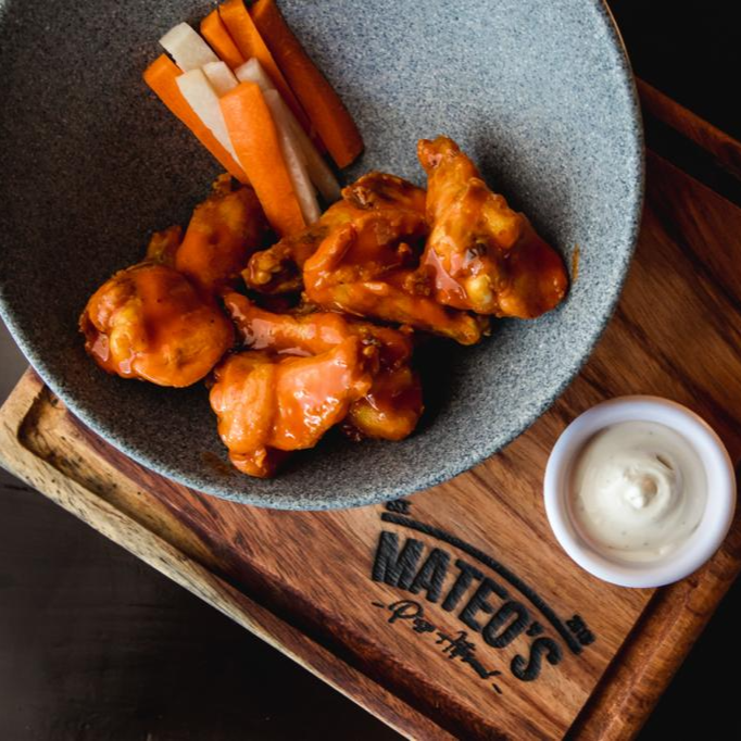 1/2 kg piezas de alitas bañadas en tu salsa favorita, acompañado de aderezo ranch y vegetales.
