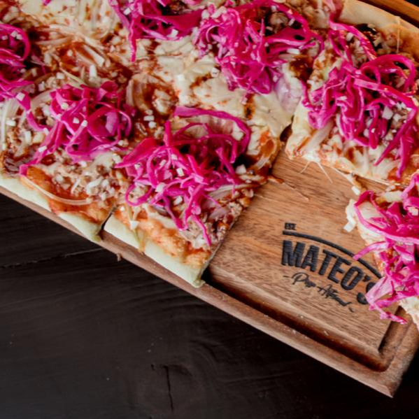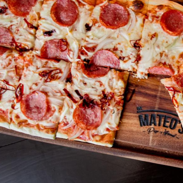 Salame, cebolla blanca, ajo, aros de chile guajillo y mozzarella.