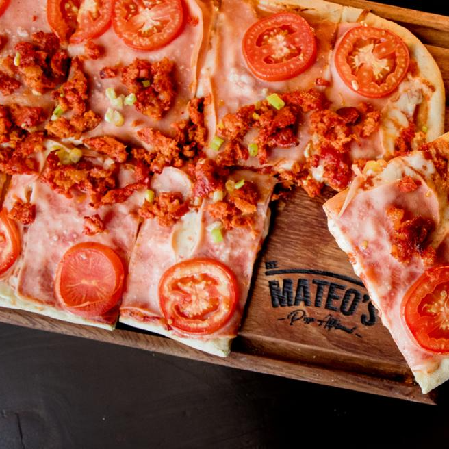 Jamón de pierna, longaniza, jitomate fresco, cebollín y mozzarella.