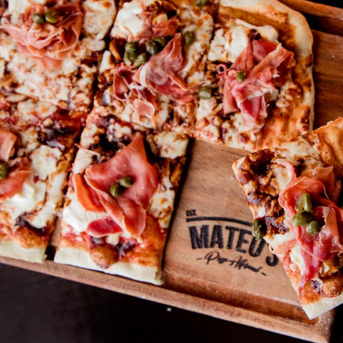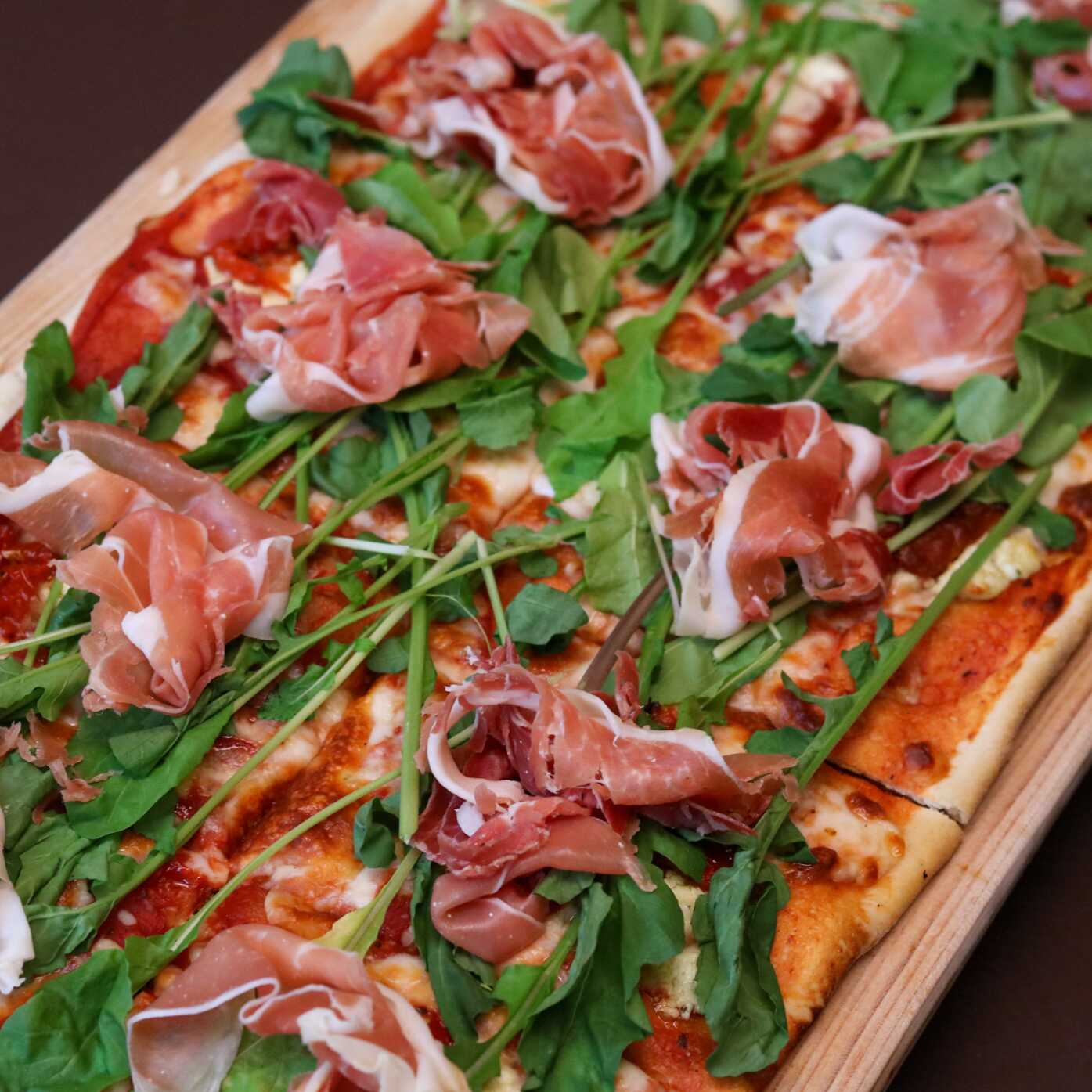Jamón serrano, queso de cabra, tomate deshidratado, arúgula y mozzarella.