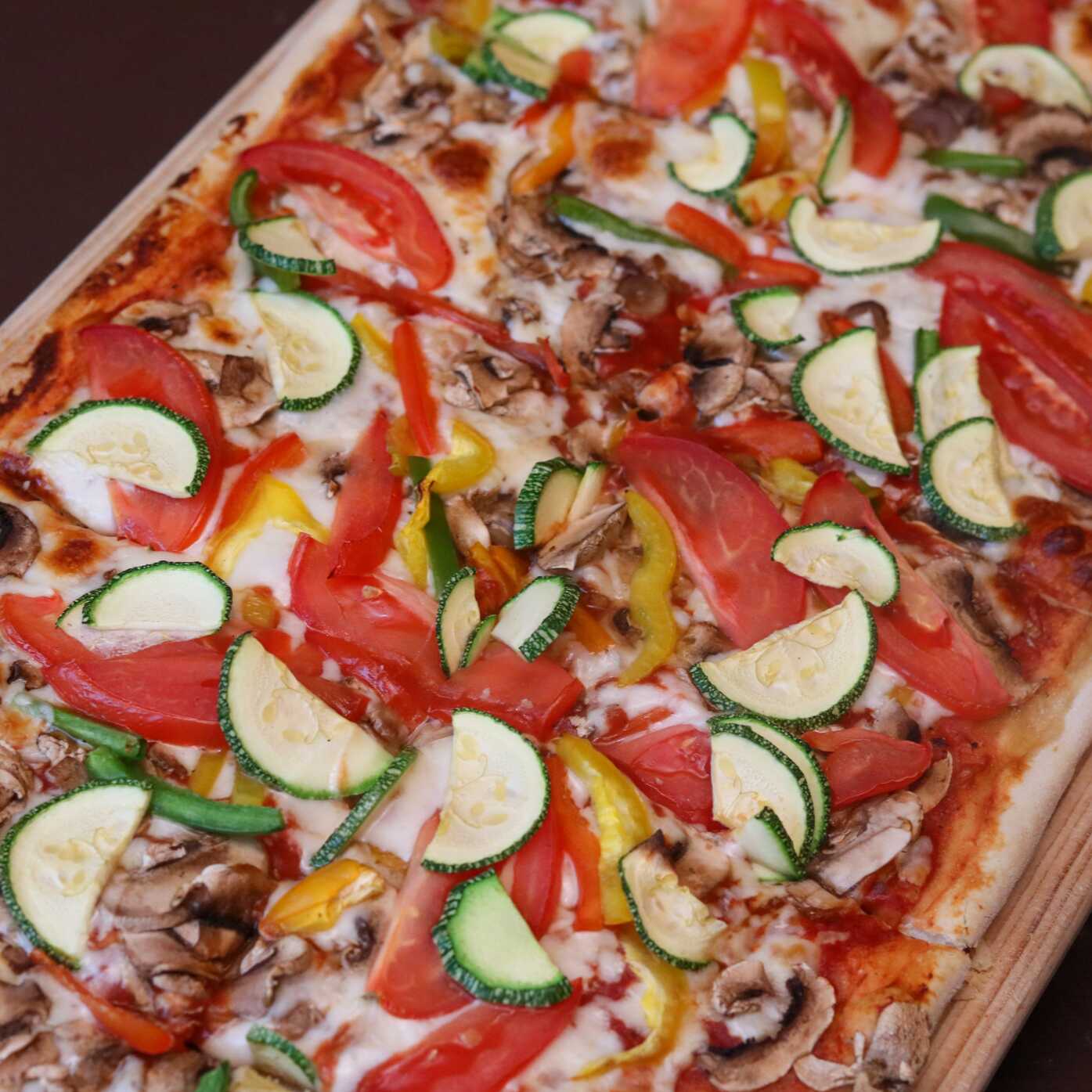 Pimientos, calabaza zucchini, champiñones, jitomate fresco y mozzarella.