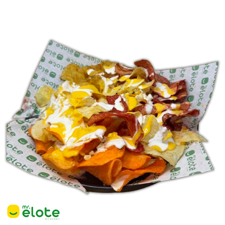 Elote tradicional acompañado con papas de tu elección bañadas en esquite, queso amarillo y crema