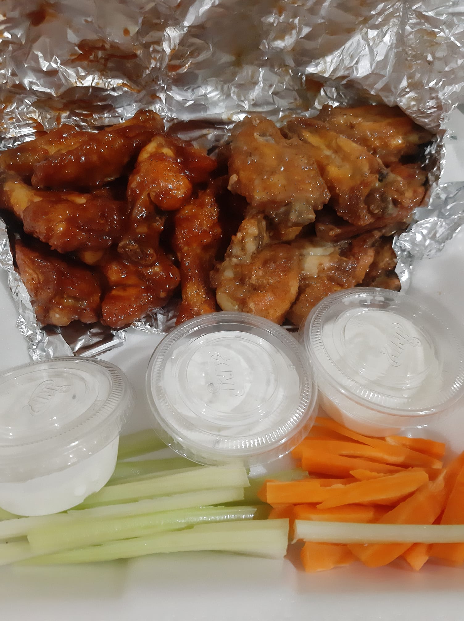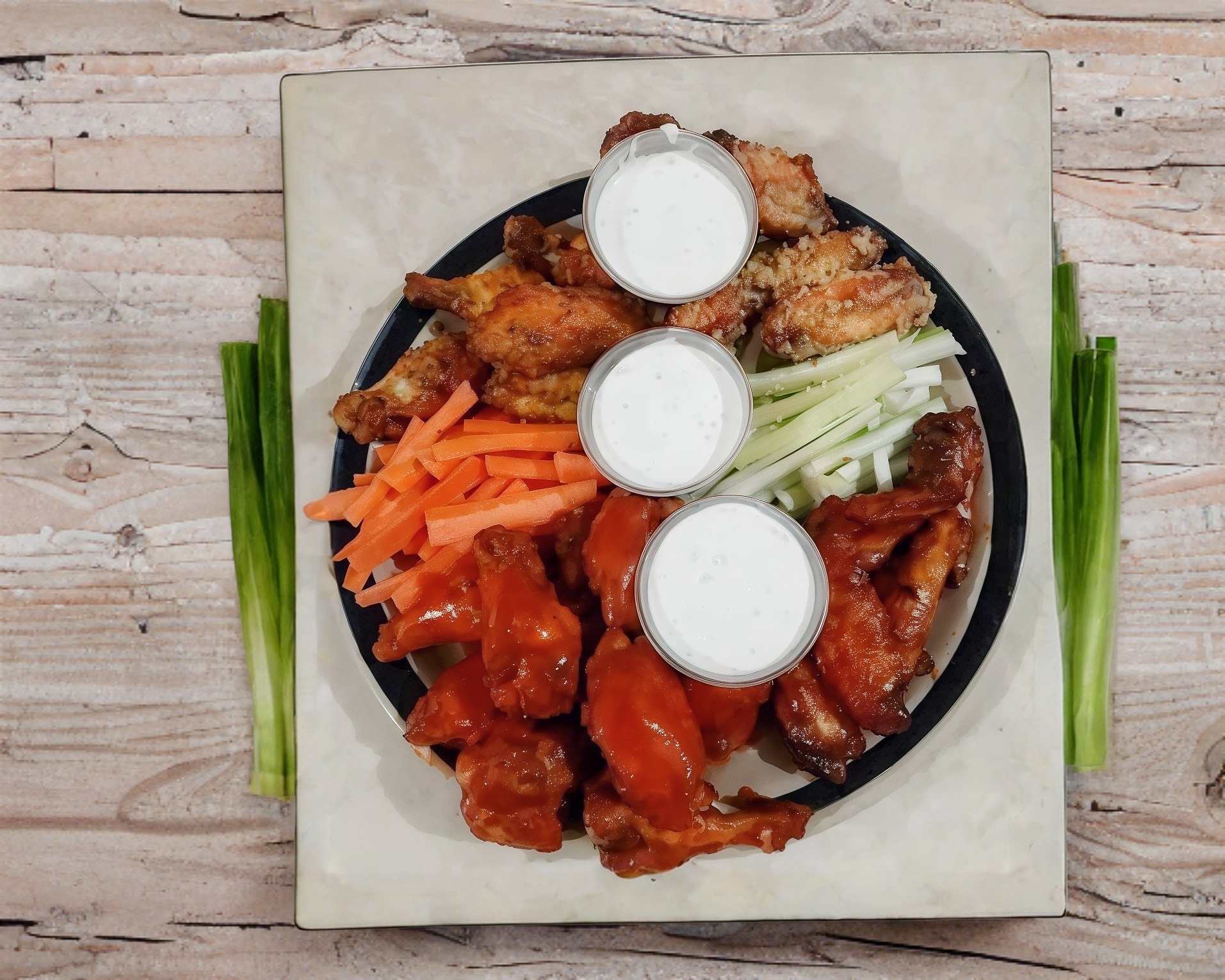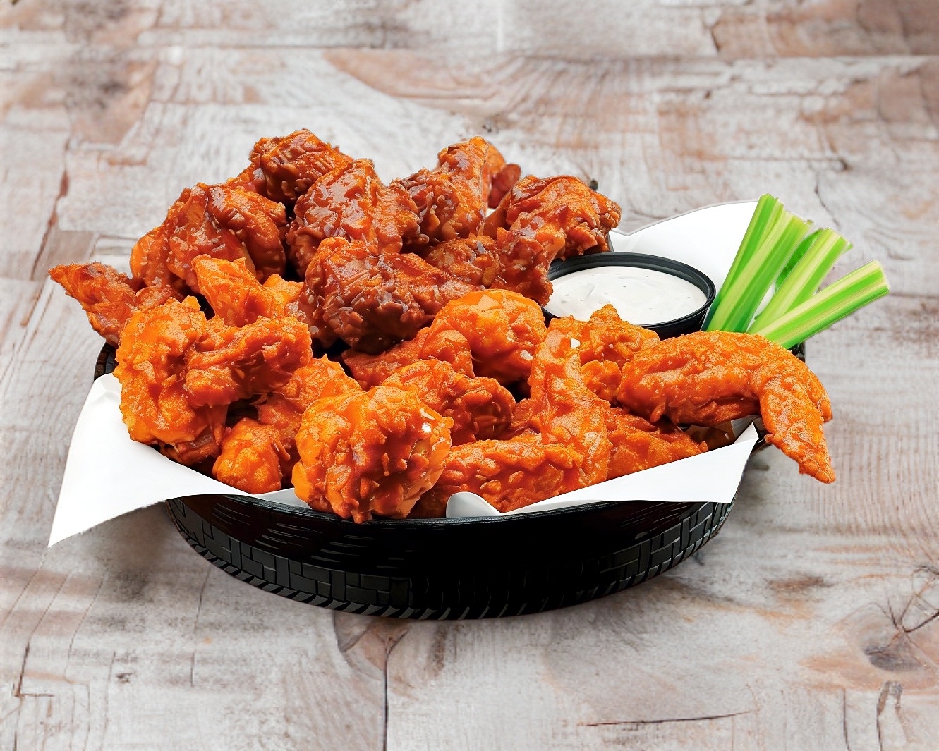 30 alitas y 2 papas onduladas. Naturales o salsa a elegir. Incluye guarnición y aderezos.