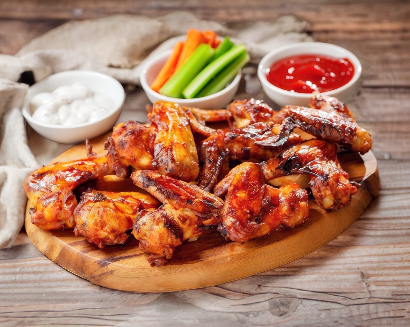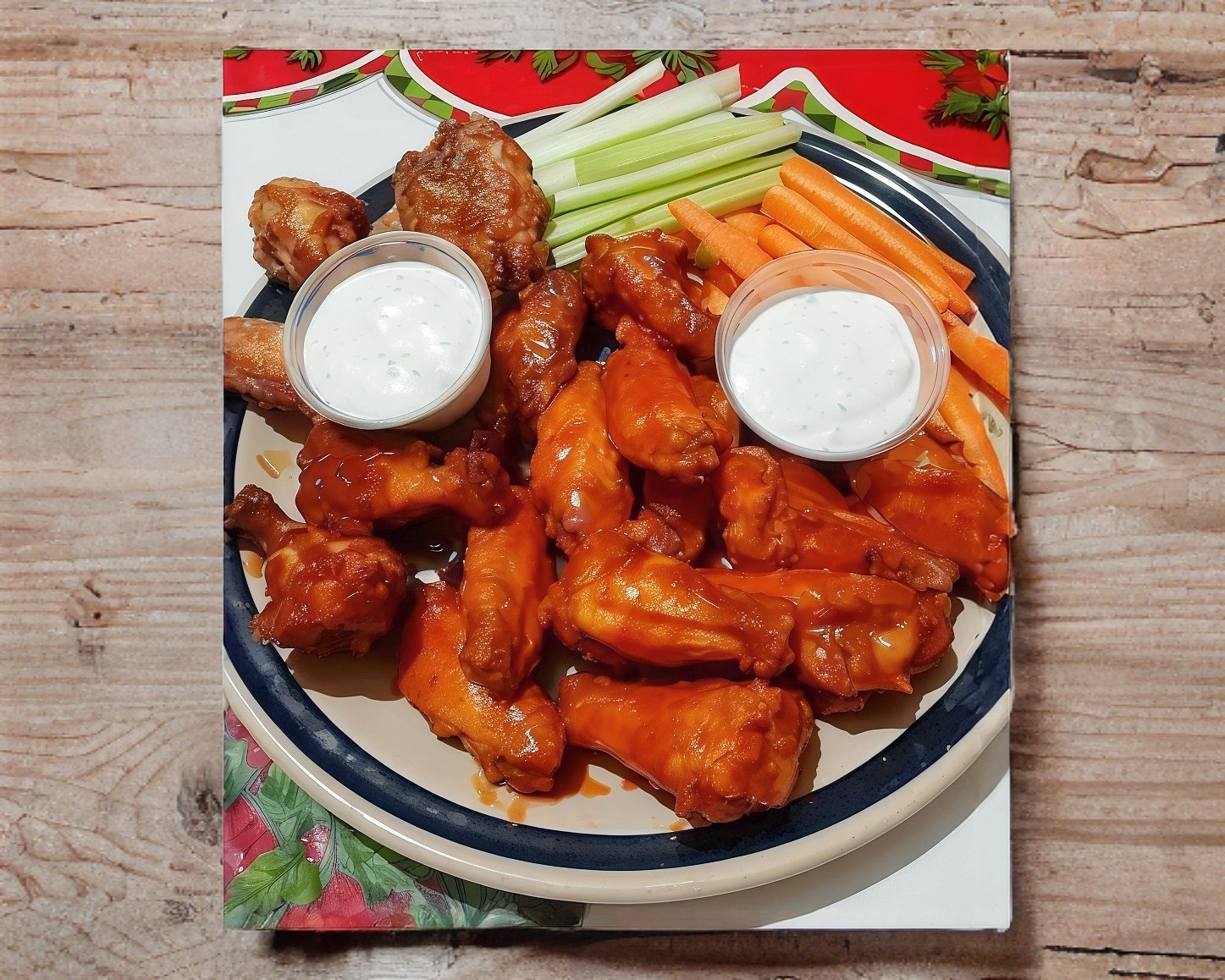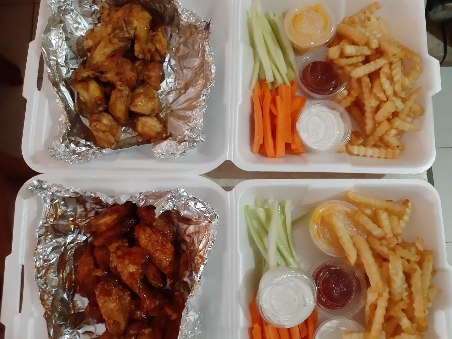 30 alitas y 2 papas onduladas. Naturales o salsa a elegir. Incluye guarnición y aderezos.