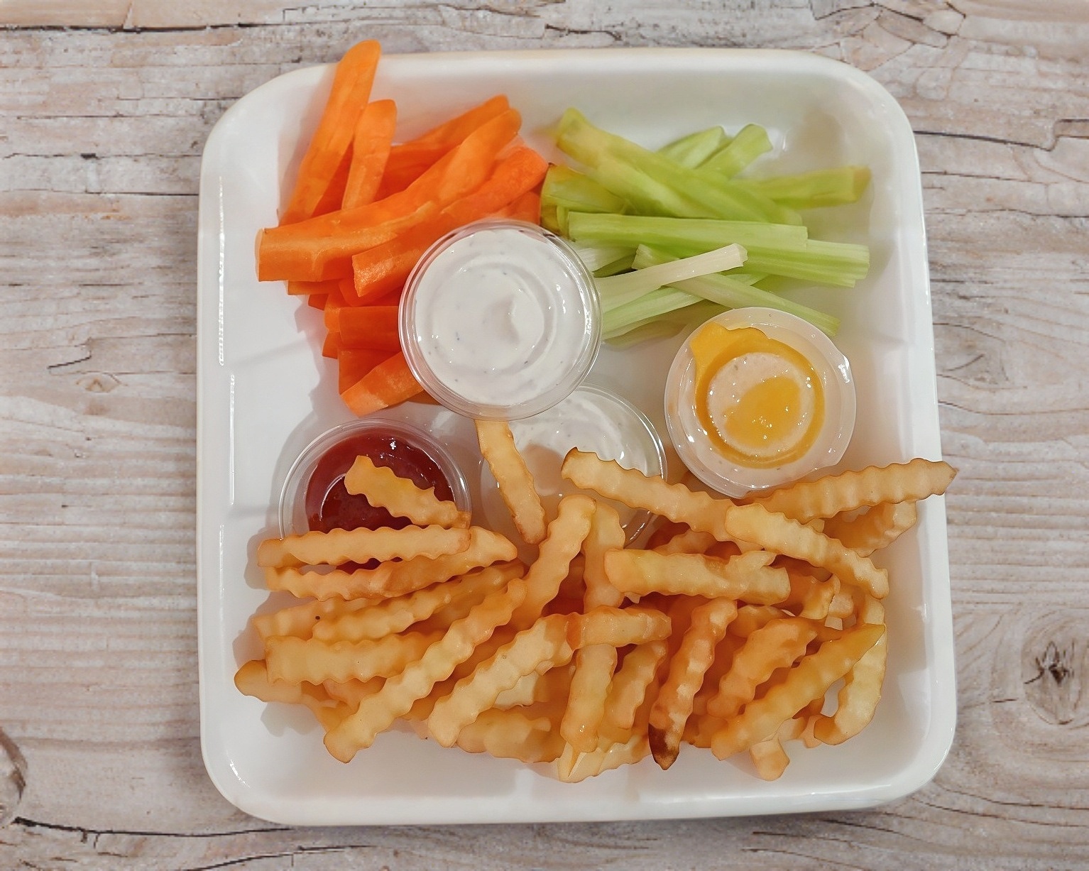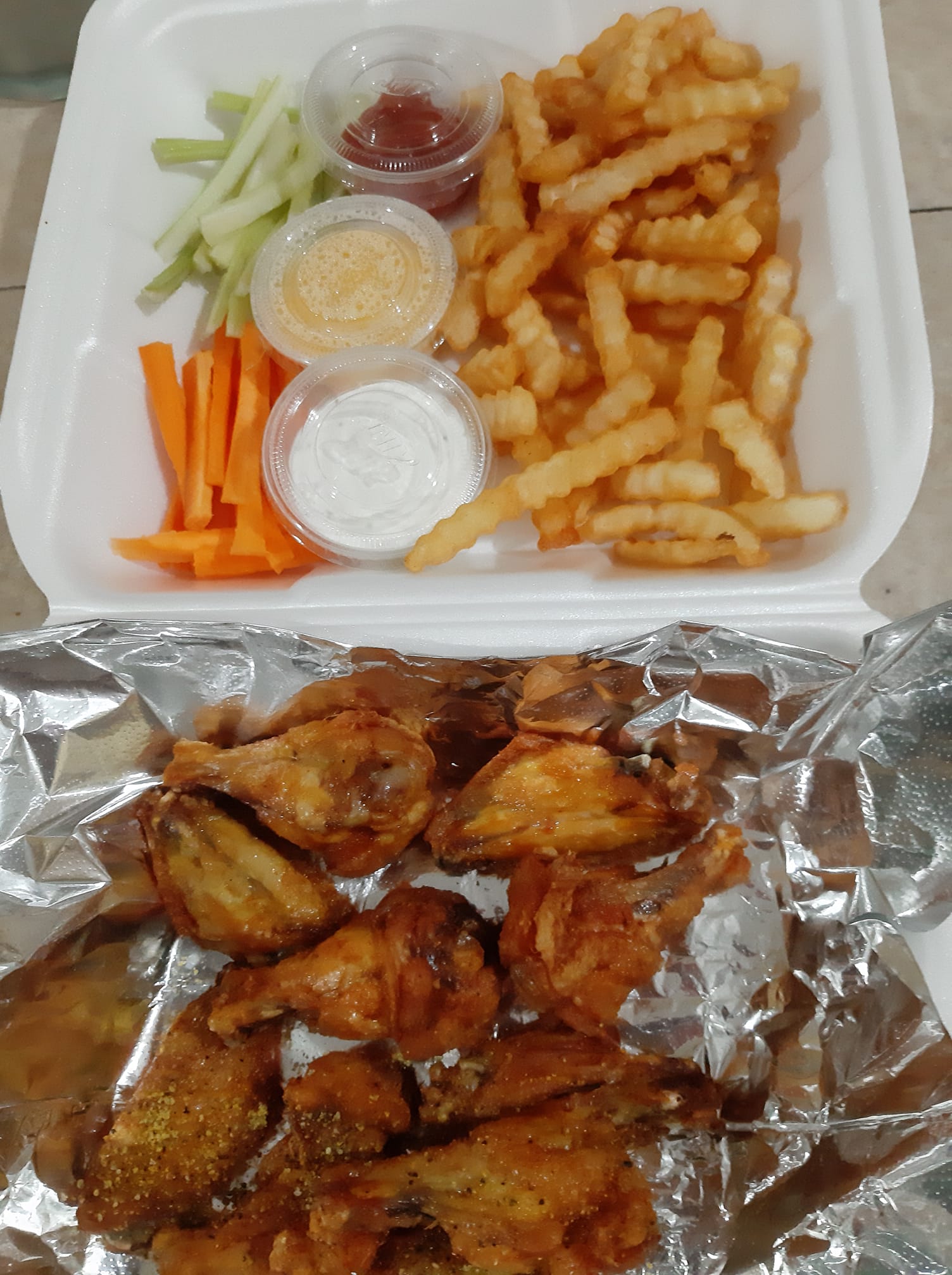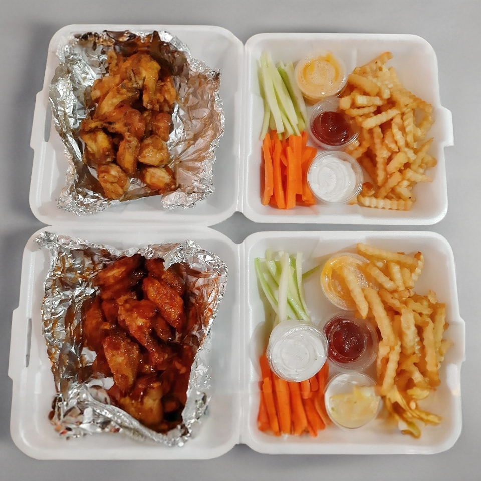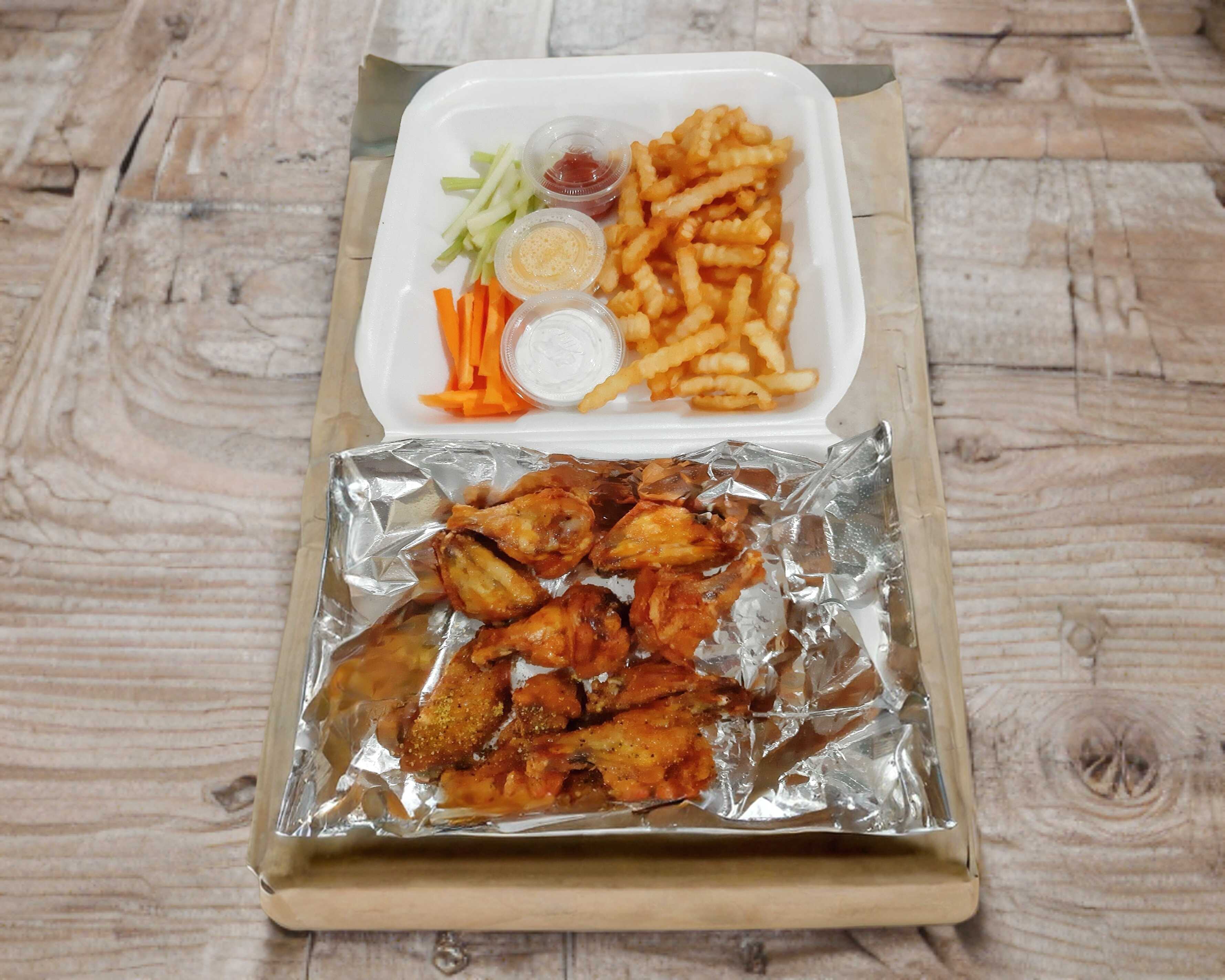 10 alitas y papas onduladas. Naturales o salsa a elegir. Incluye guarnición y aderezos.