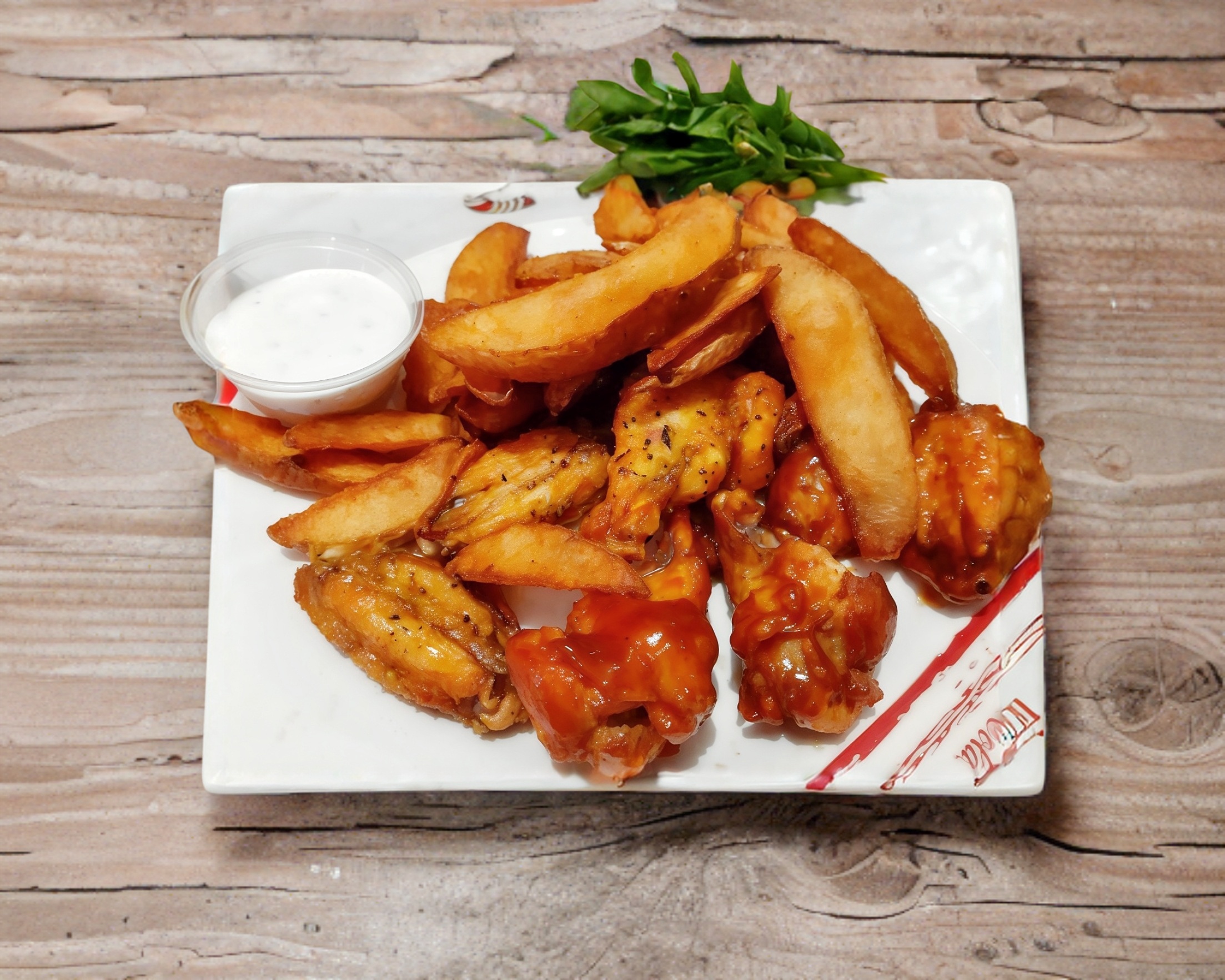 10 alitas y papas gajo. Naturales o salsa a elegir. Incluye guarnición y aderezos.