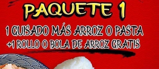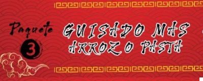 3 guisados más arroz o pasta ,salsa de soya y tomate.