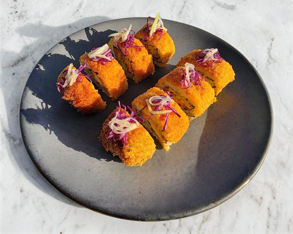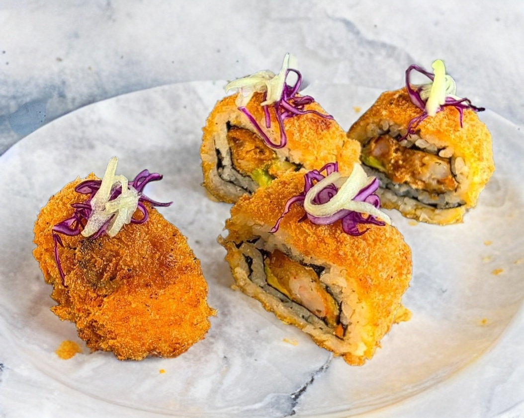 camaron tempura , vegetales , queso crema con chipotle y laminas de aguacate