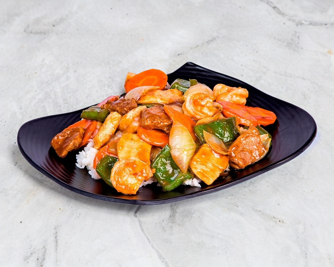 Arroz gohan bañado con mix de verduras, pollo, camarón, cerdo y salsa teriyaki.