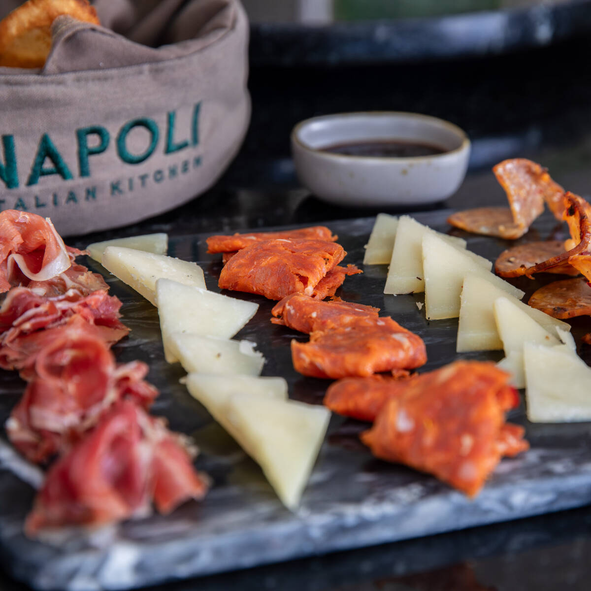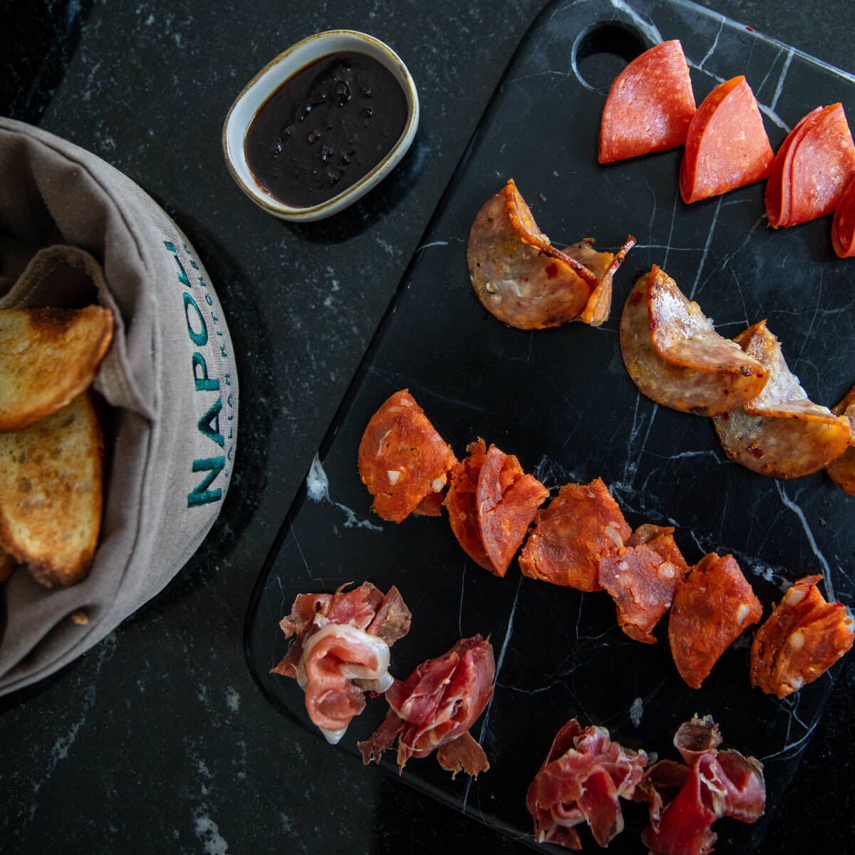 Chorizo pamplona, prosciutto, salame calabrese, salame milano (30 gr. c/u). Acompañada de mermelada de tomate y pan con mantequilla.