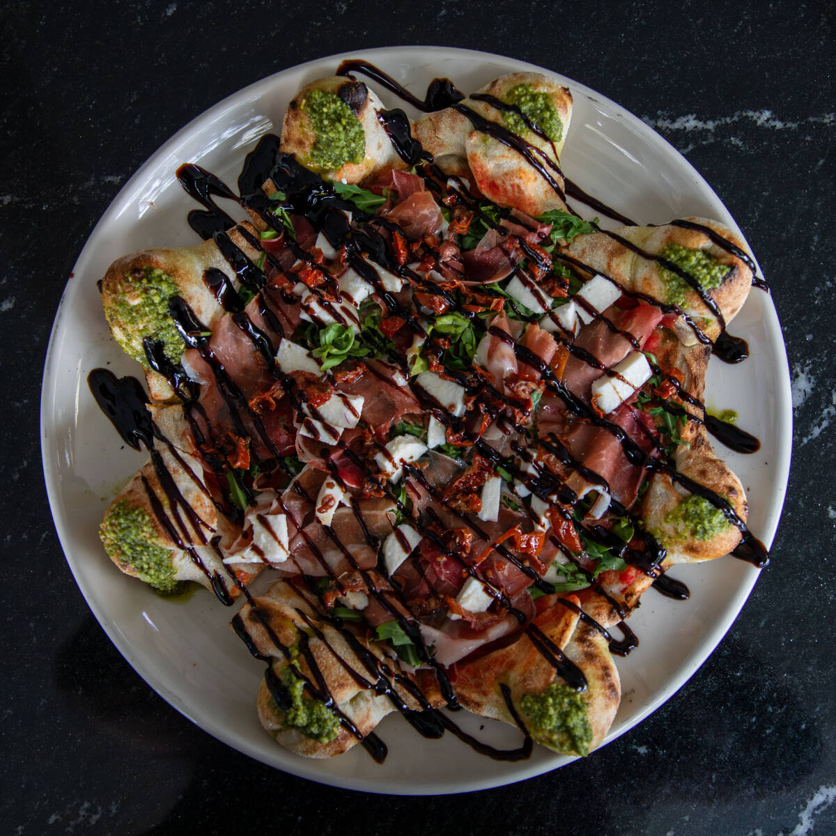 Nuestra versión de la pizza italiana con orilla rellena de queso mozzarella americano y Philadelphia. Una mezcla de prosciutto, mozzarella fior di latte (100 gr.), arúgula, jitomate deshidratado, aderezo balsámico y pesto.