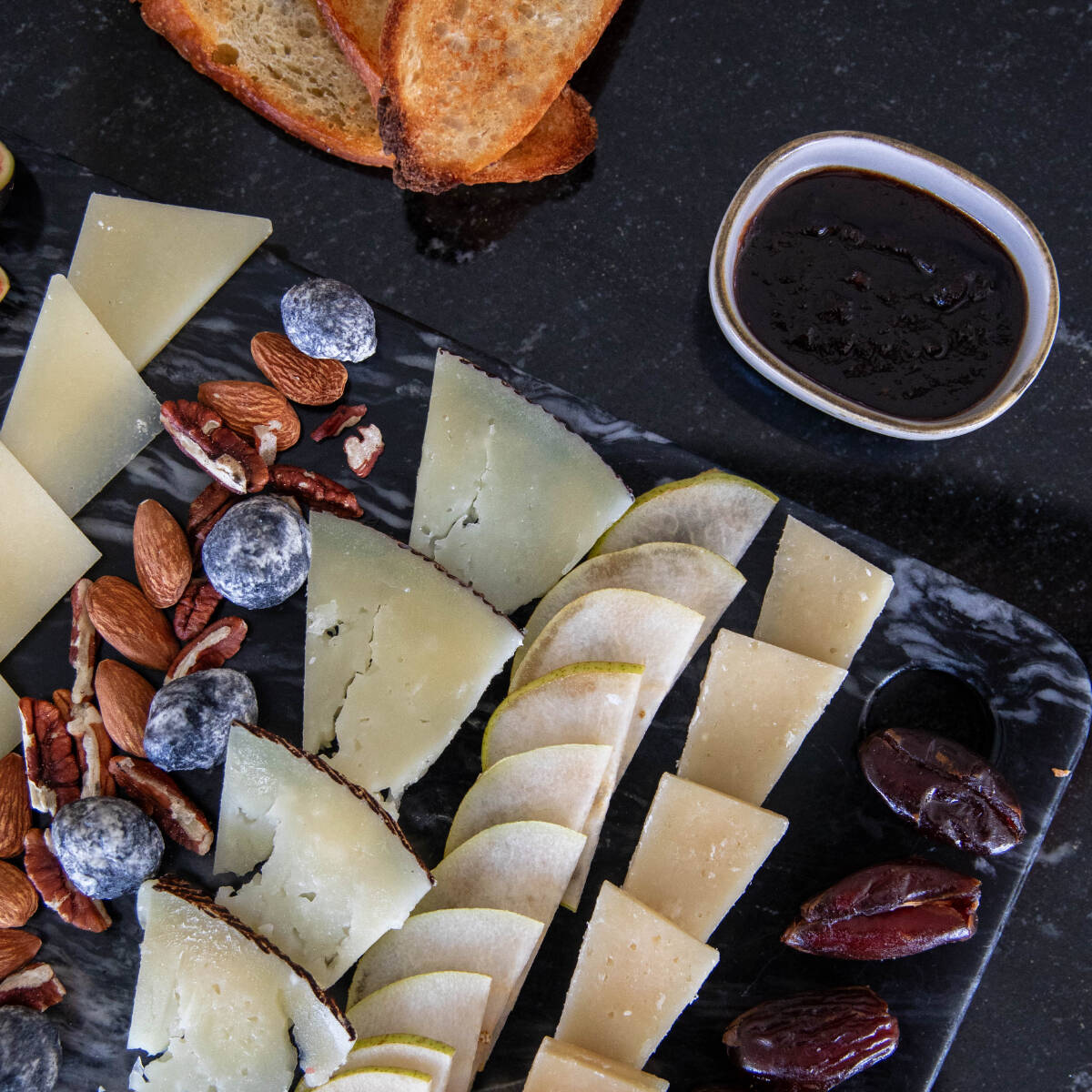 Tabla mixta con Parmigiano Reggiano DOP italiano, Grana Padano DOP, Manchego DOP Don Bernardo Oro Viejo, queso crema y queso de cabra con ceniza (30 gr. c/u), zarzamora, pera, uva, higo, fresa y frambuesa. Acompañada de focaccia y mermelada de tomate deshidratado.