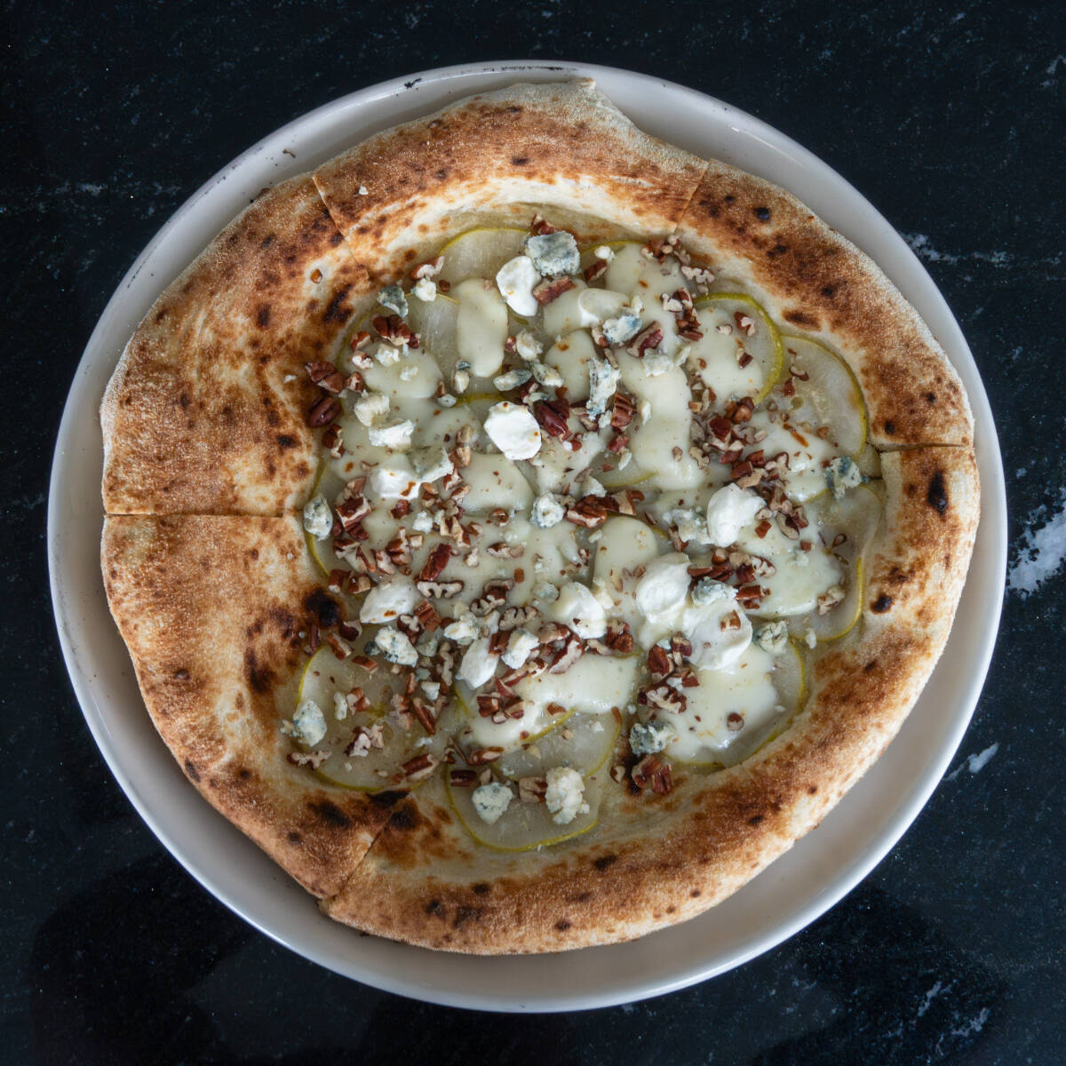 Queso mozzarella fior di latte (100 gr.), queso crema (30 gr.), queso azul (25 gr.), pera fresca y nuez.