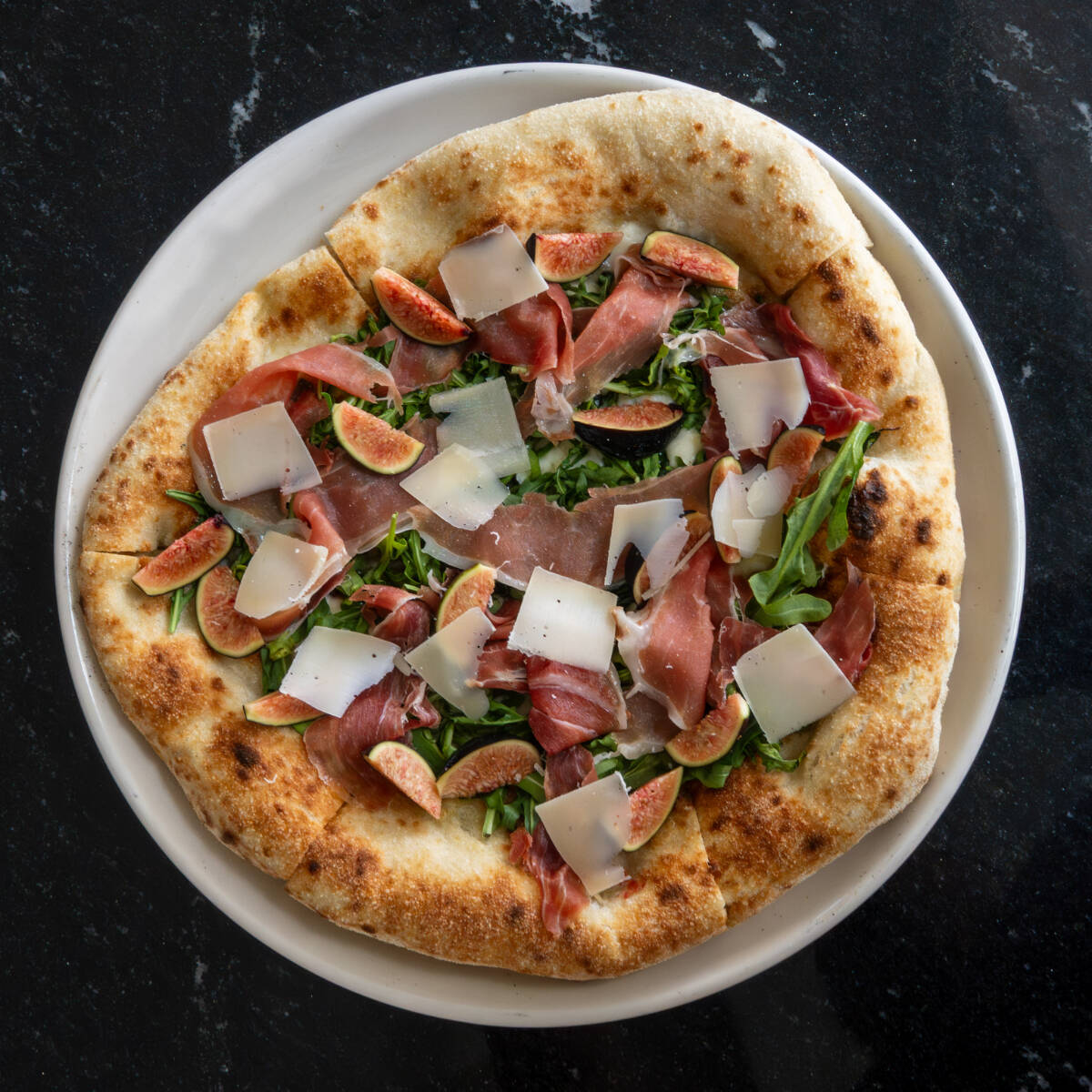 Queso mozzarella fior di latte (100 gr.), queso Parmigiano Reggiano DOP (15 gr.), prosciutto nostrano (50 gr.), higo fresco, arúgula, aceite de oliva extra virgen y albahaca fresca.