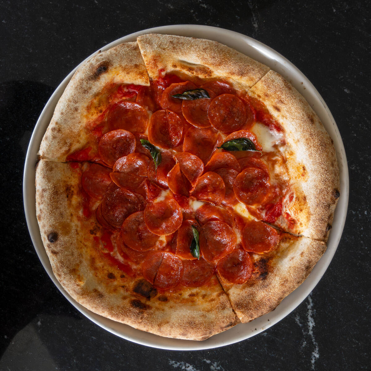 Base de pomodoro, queso mozzarella fior di latte 100 g, aceite de oliva extra virgen y pepperoni 75 g.