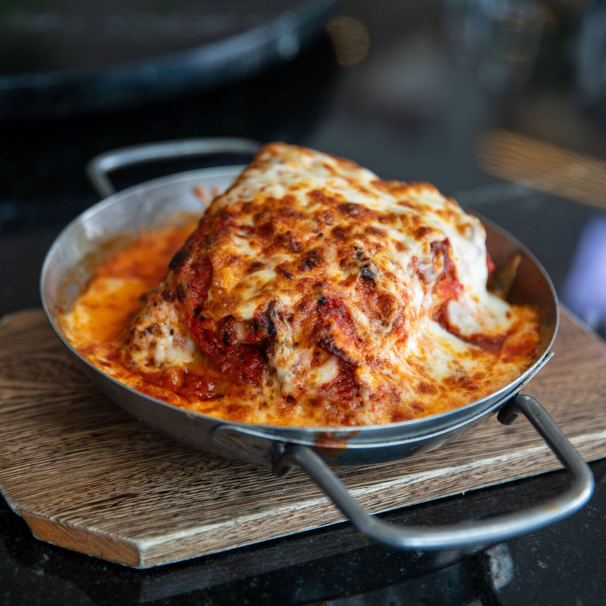 Pechuga empanizada crujiente gratinada, con salsa clásica pomodoro y acompañada con ensalada.