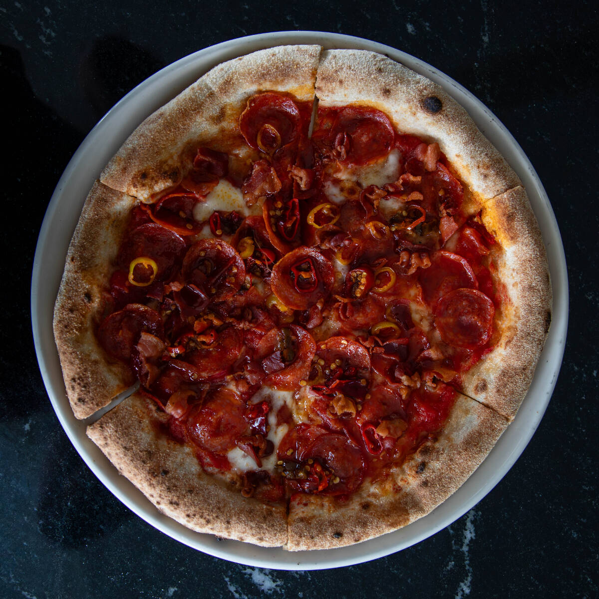 Base de pomodoro, mozzarella fior di latte (100 gr.), tocino (50 gr.) pepperoni (25 gr.), champiñón, cebolla morada, pimiento cascabelilla y peperoncino.