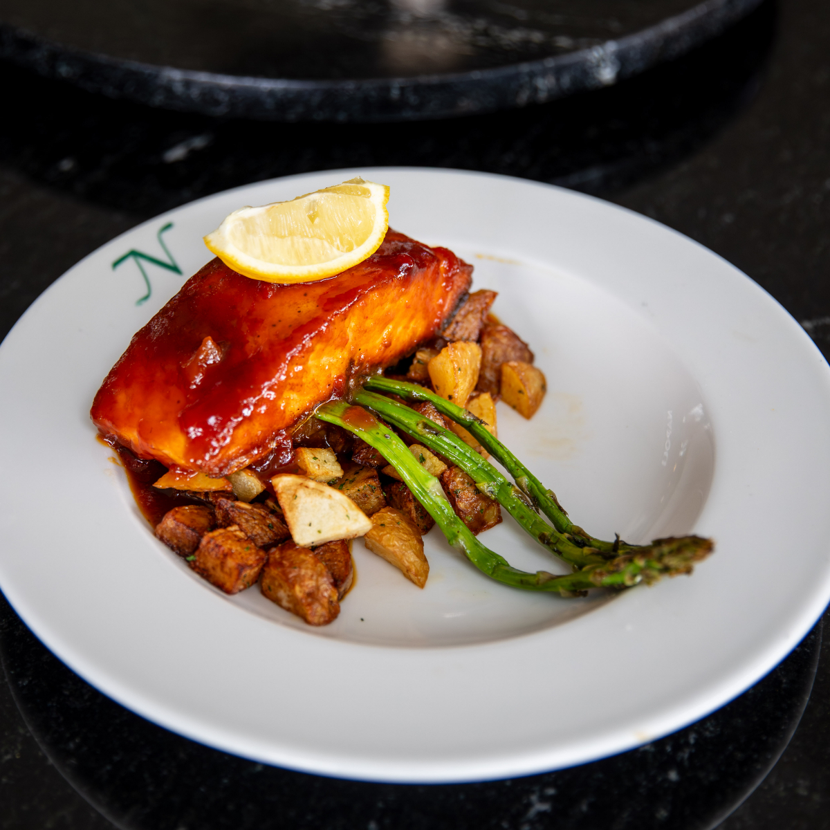 Caramelizado en sartén con salsa agridulce sobre cama de papas con romero y espárragos.