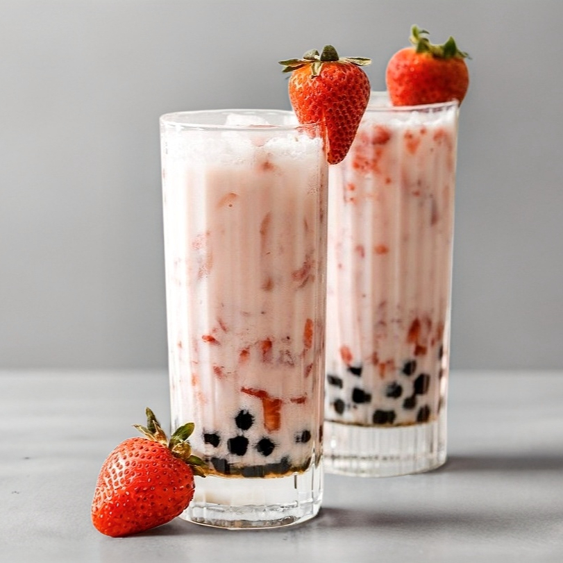 Bebida a base de leche sabor a fresas con crema con hielo y perlas de tapioca (16 Oz.)