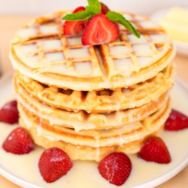 Delicioso waffle acompañado de fresa, plátano, durazno y galleta oreo