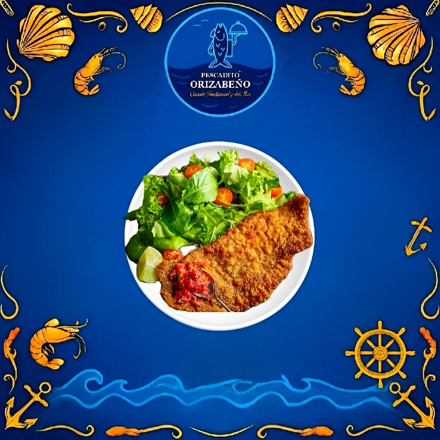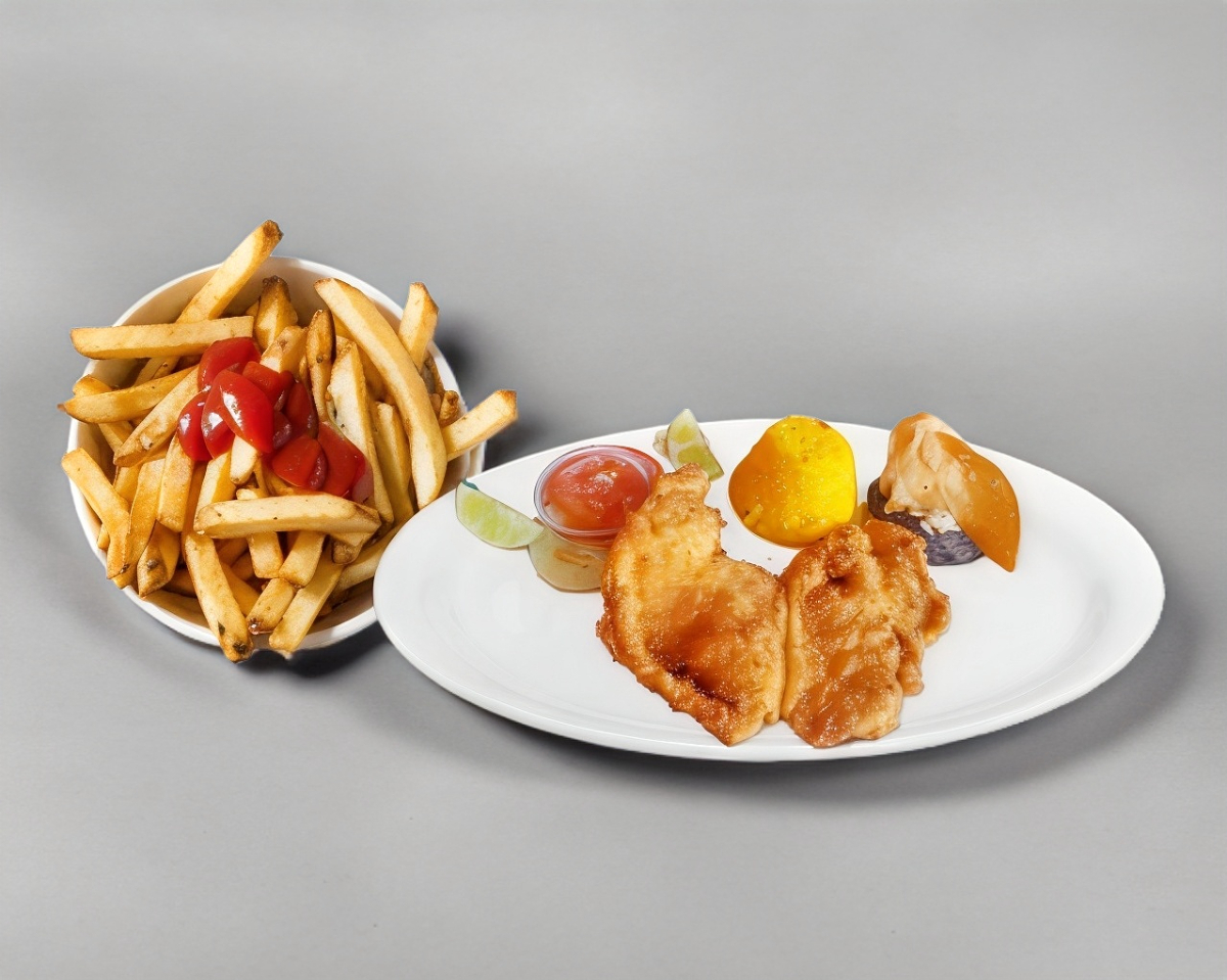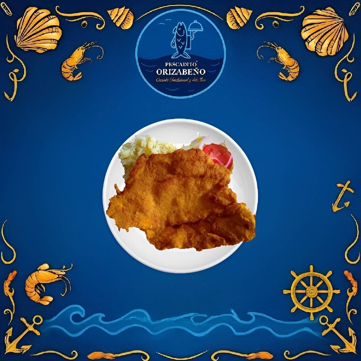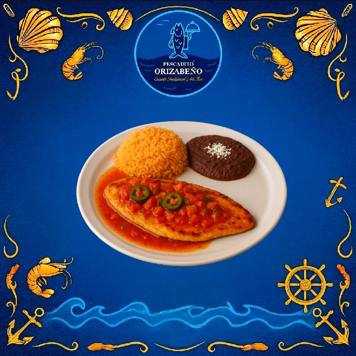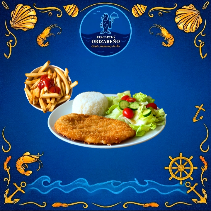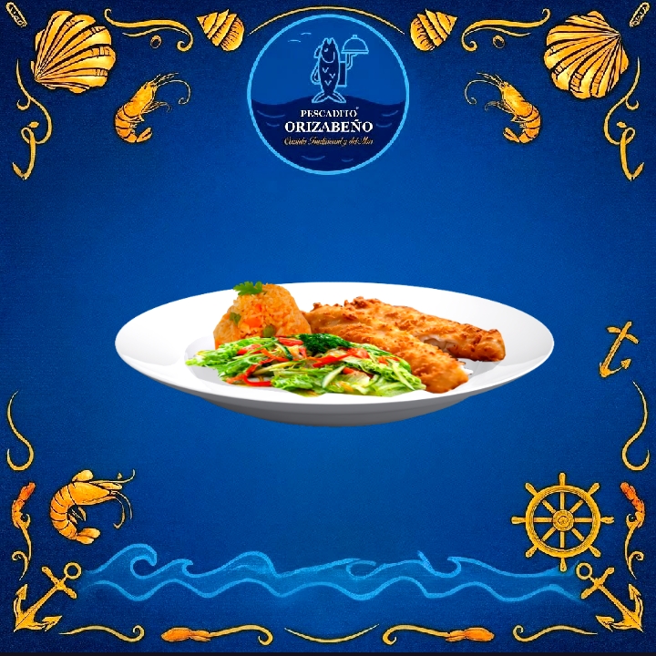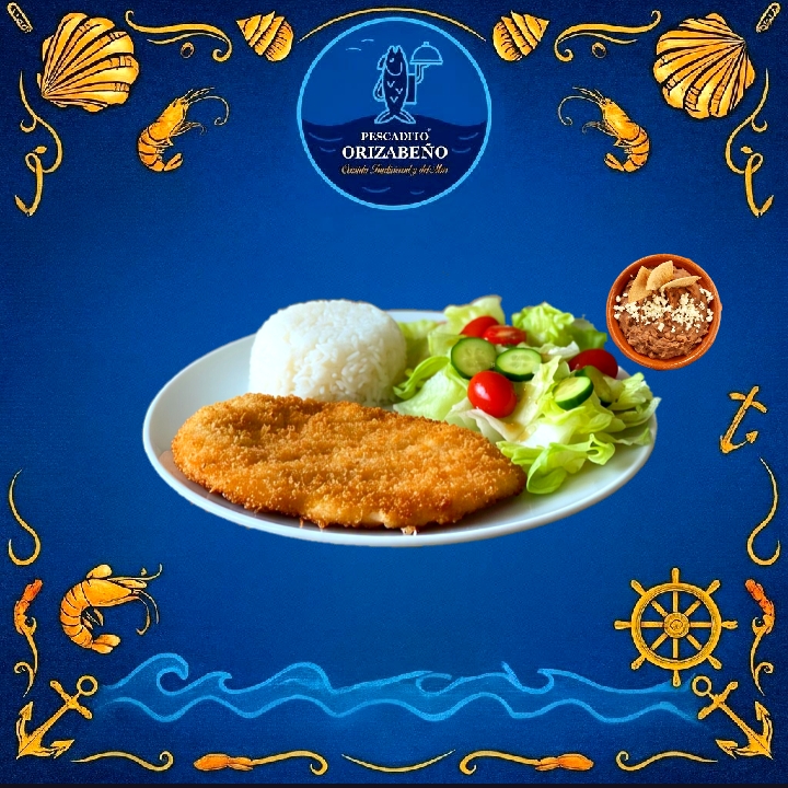 FILETE DE PESCADO EMPANIZADO JUMBO, ACOMPAÑADO CON ARROZ, ENSALADA, SALSA Y TORTILLAS