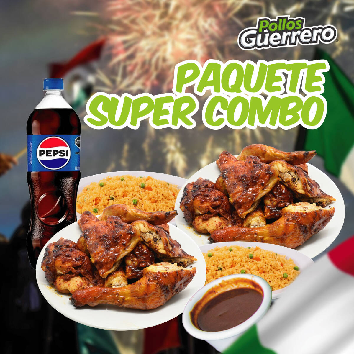 2 pollos Adobados o rostizados + 2 guarniciones de arroz de 350g + 1 refresco familiar + 1 salsa especial