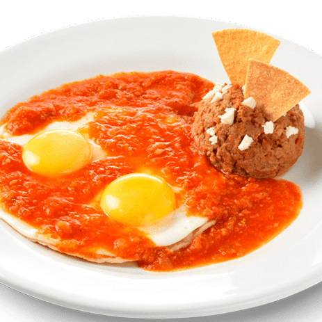 2 Huevos estrellados sobre tortilla con frijoles refritos, bañados en salsa roja y acompañados de arroz