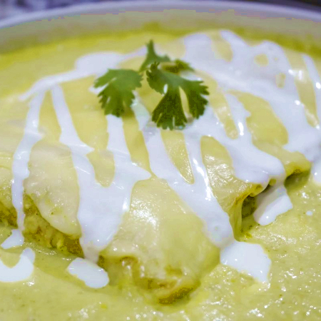 3 enchiladas de pollo bañadas en crema de rajas poblanas decoradas con crema, queso y cebolla