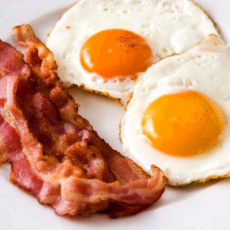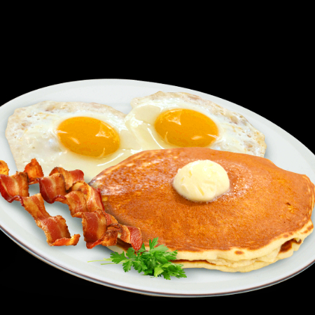 2 hot cakes y 2 huevos estrellados divididos por 2 tiras de tocino acompañado de un topping a elegir
