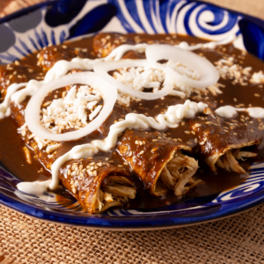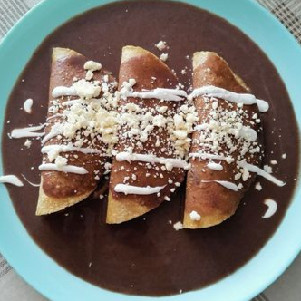 Tortillas suaves rellenas y bañadas en mole tradicional, con ese equilibrio perfecto entre dulzor y especias 🍫🔥, acompañadas de queso y crema 🤍🧀. Un platillo profundo, elegante y lleno de historia 😍✨