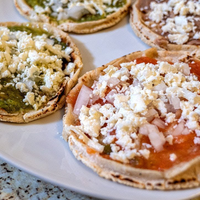 BBase crujiente de maíz con frijoles cremosos, ingredientes frescos, salsa tradicional y un toque de queso y crema 🤍🧀. Ligera, fresca y llena de sabor 🔥🌽