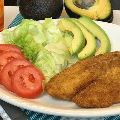 Filete de pescado empanizado, crujiente por fuera y suave por dentro 🐟✨. Acompañado de guarniciones que realzan su sabor 😍🔥