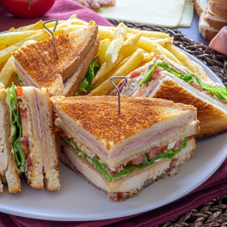 Clásico club con pan tostado, capas generosas de pollo o jamón, queso 🧀, tocino 🥓, lechuga fresca 🥬 y jitomate 🍅. Abundante, elegante y perfecto para compartir 🤤✨