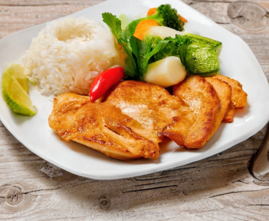 Pechuga a la plancha con verduras salteadas y arroz. Incluye agua y tortillas.
