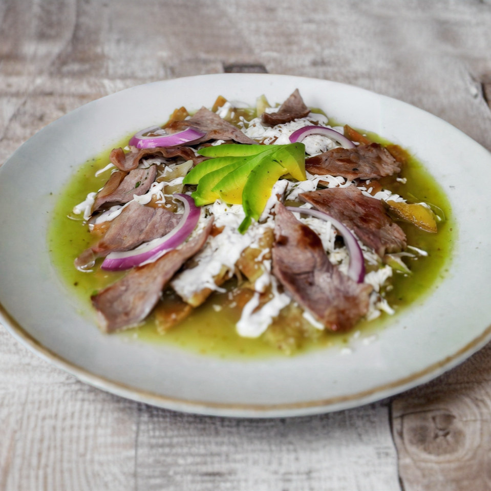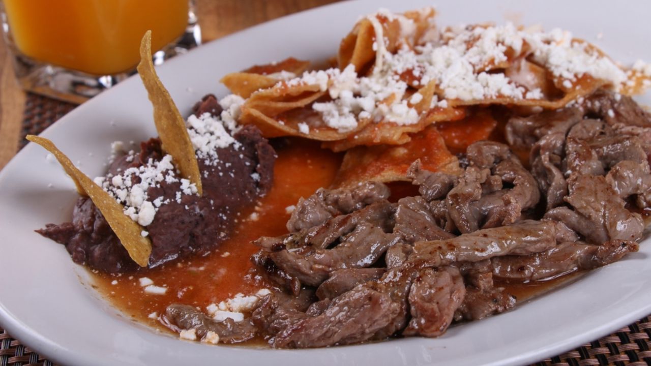 Chilaquiles con bistec de res (incluye café, pan y fruta de 08:30-01:00pm).
