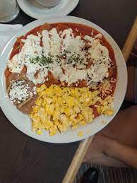Chilaquiles rojos con pollo (incluye café, pan y fruta de 08:30-01:00pm).