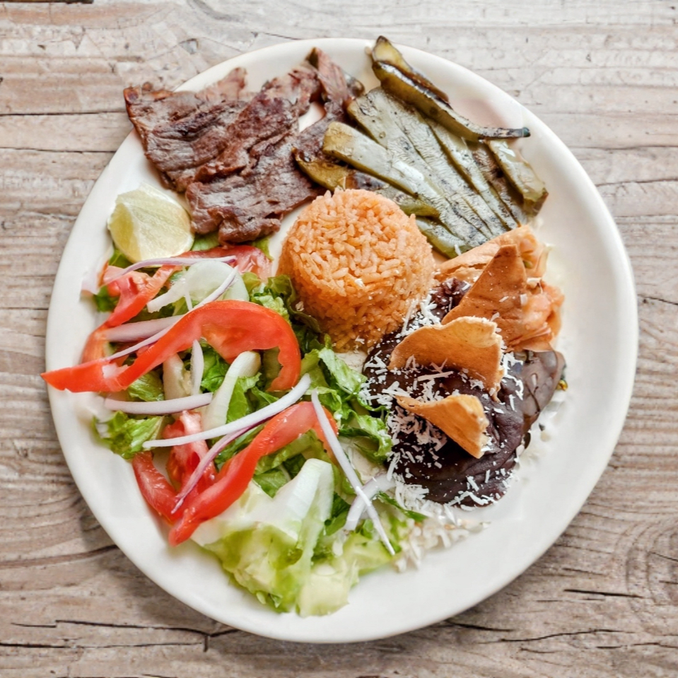 Cecina, frijoles refritos, nopal asado, ensalada y arroz
