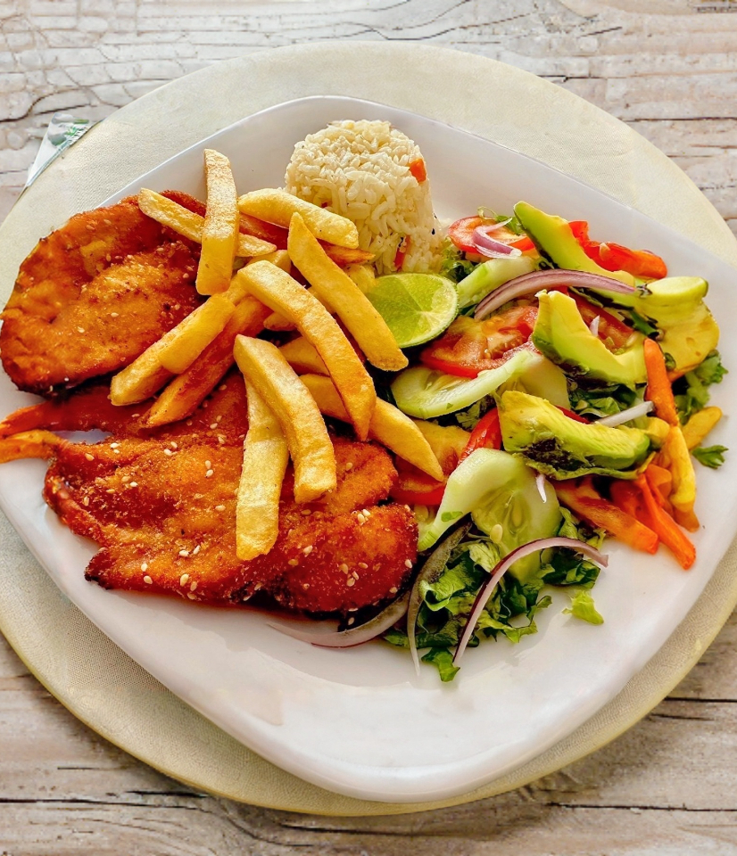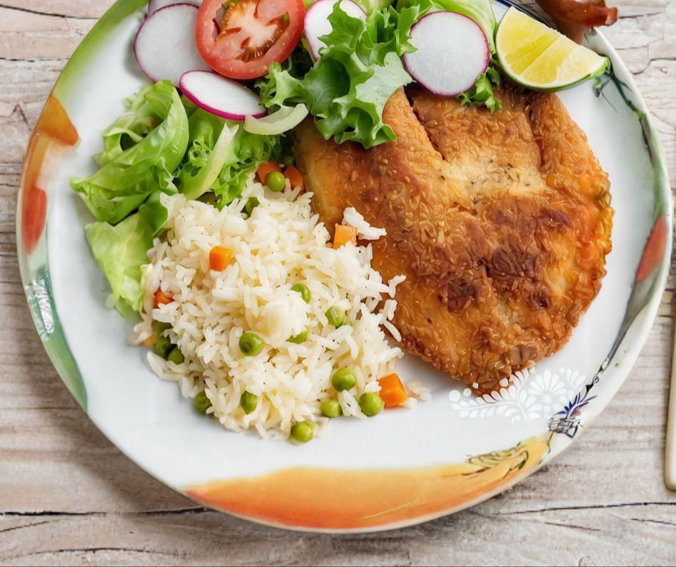 Pechuga de pollo empanizada, acompañada de ensalada fresca y arroz.