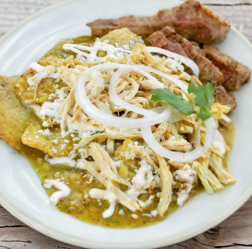 Chilaquiles verdes con pollo (incluye café, pan y fruta de 08:30-01:00pm).