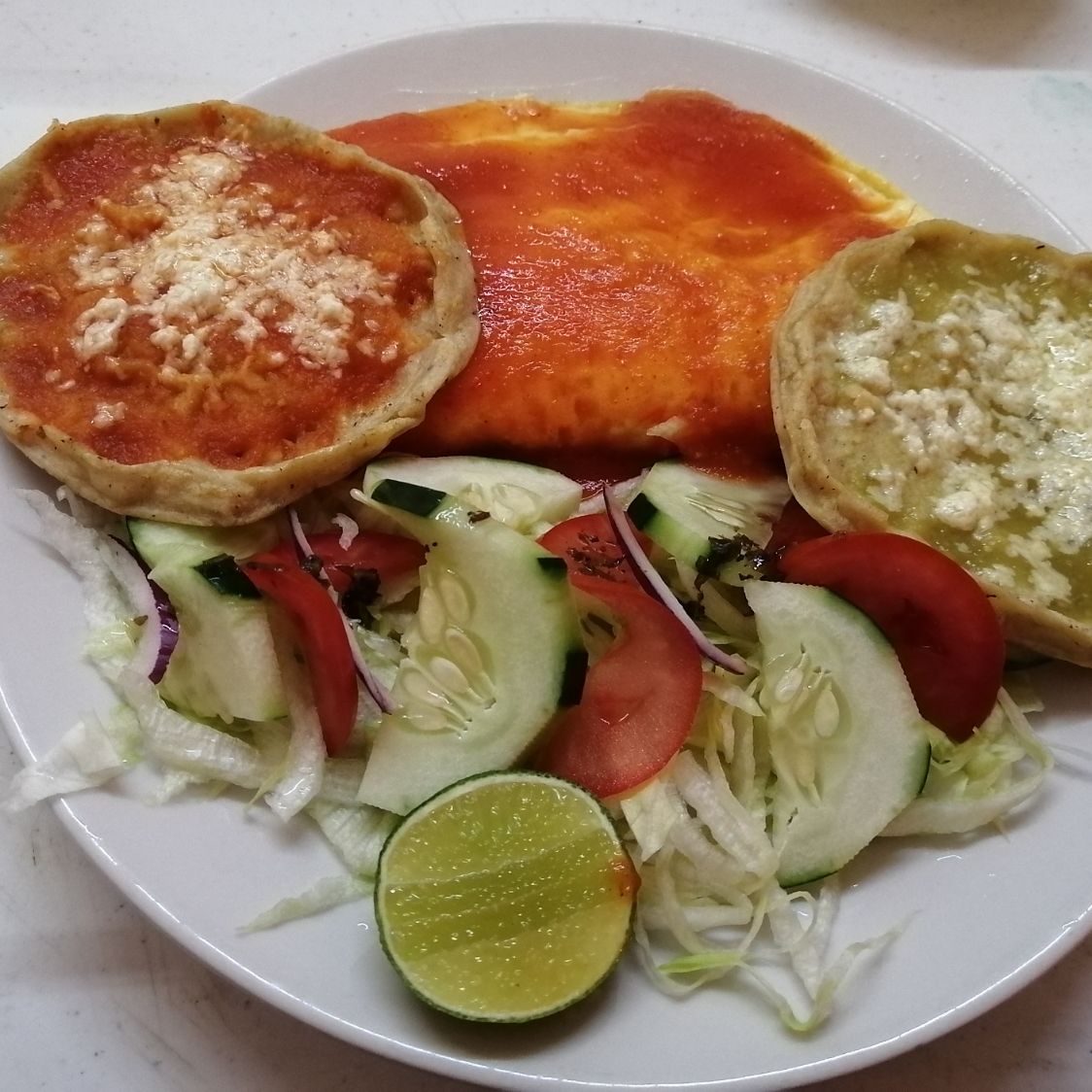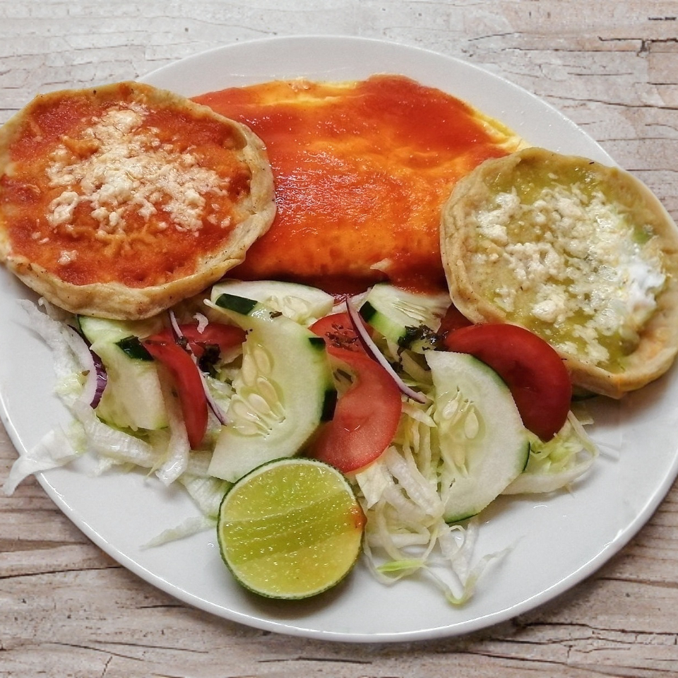 Rajas poblanas con queso bañadas en salsa y 2 picaditas.