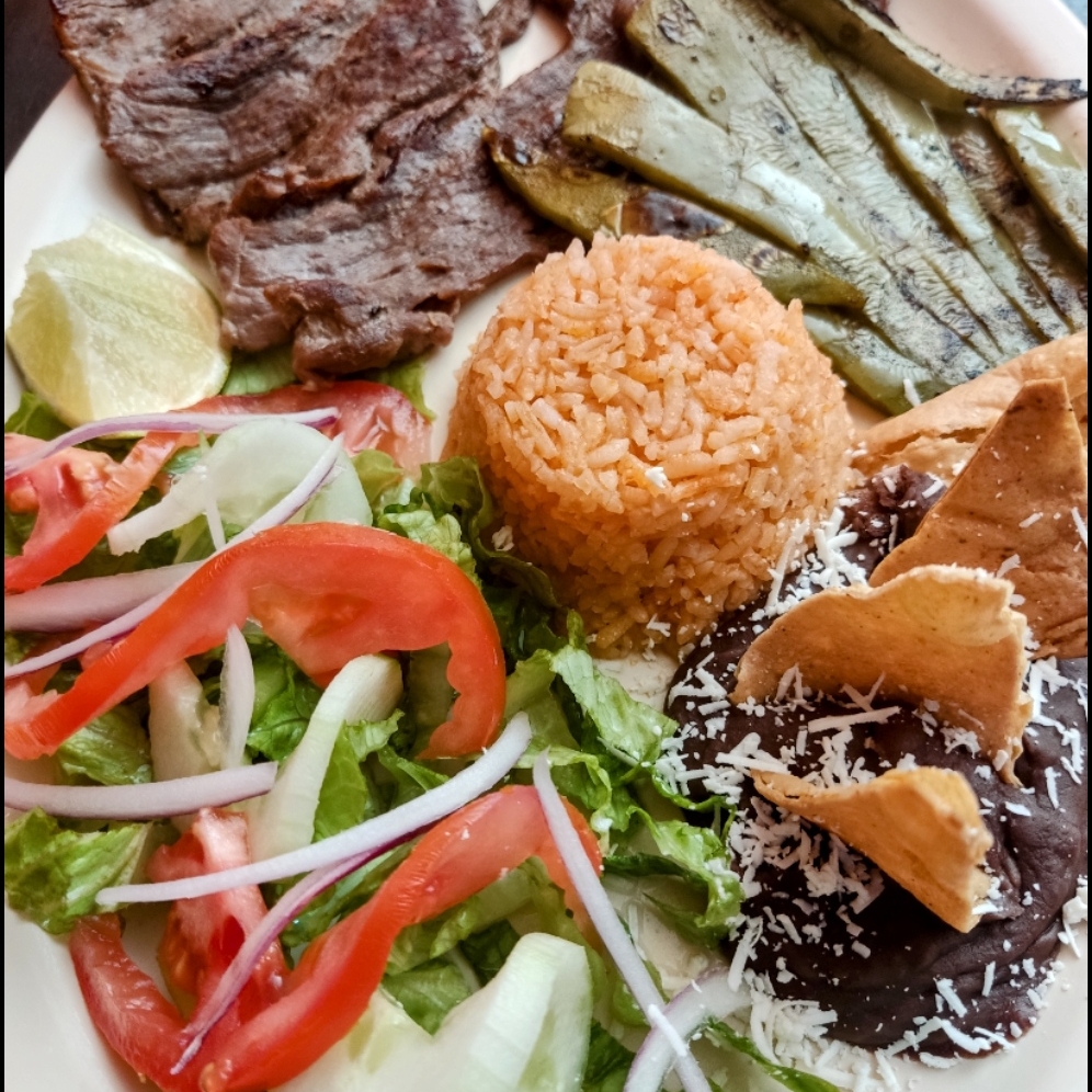 Arrachera acompañada de 2 picadas, plátanos fritos, arroz, ensalada y papas.