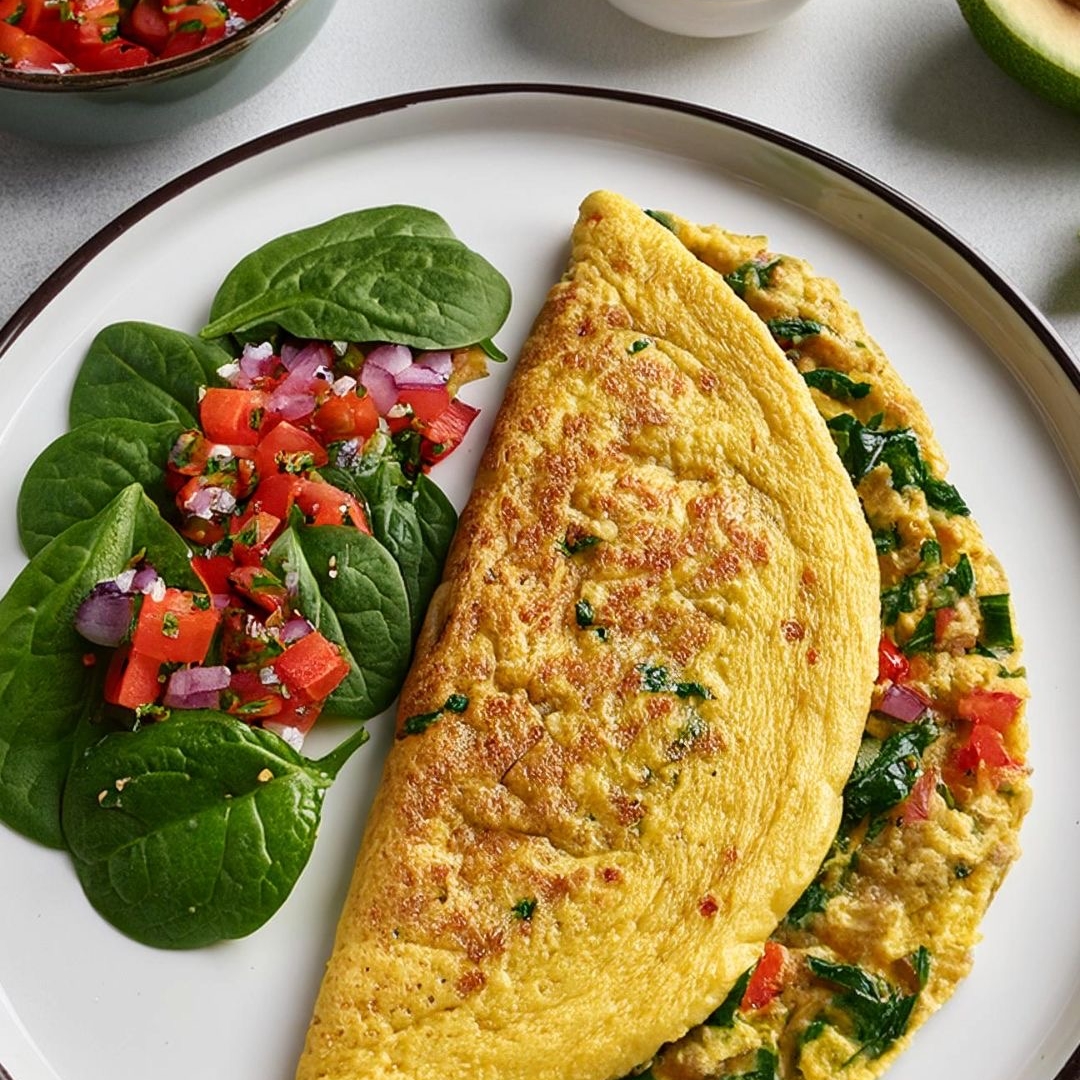 Tortilla de huevo rellena de pollo, pimiento, champiñones y queso.