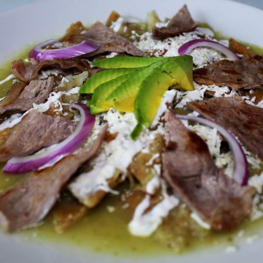 Chilaquiles con bistec (incluye café, pan y fruta de 08:30-01:00pm).