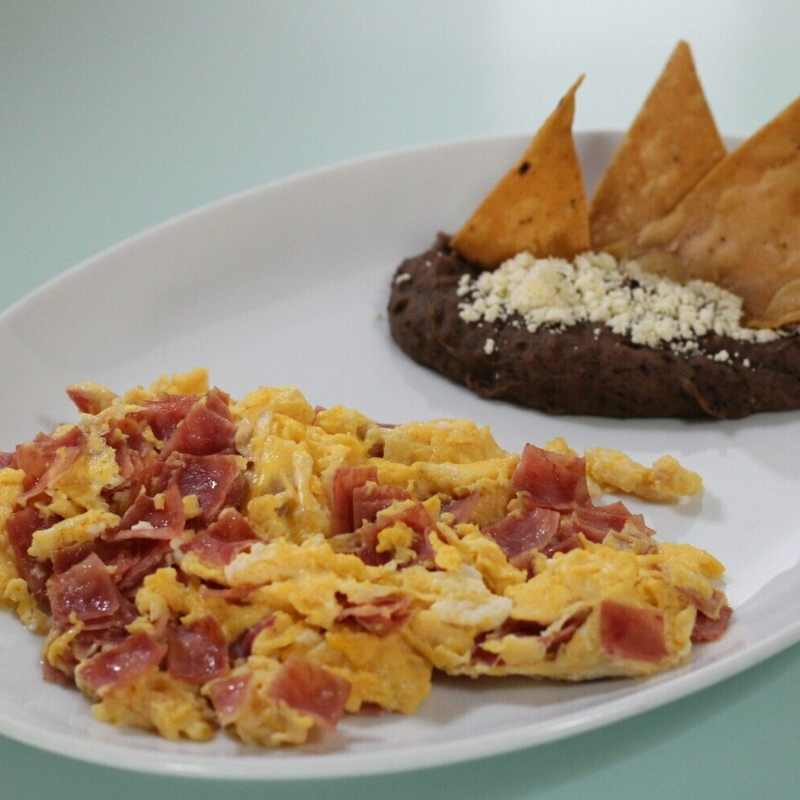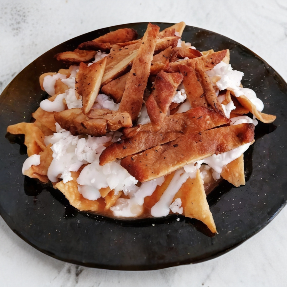 Tortilla frita bañada en salsa acompañada de pollo, queso, crema y cebolla