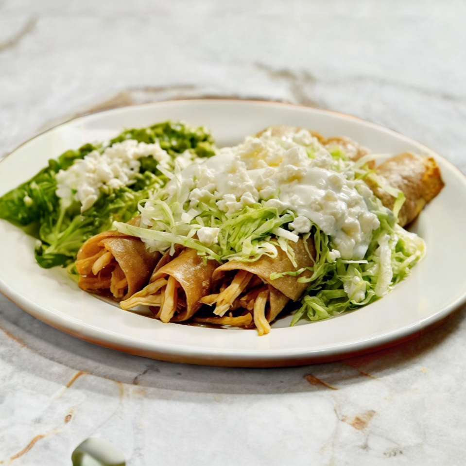Tacos de pollo, dorados en aceite, acompañados de lechuga, crema y queso. Incluye sopa, arroz y agua de sabor.