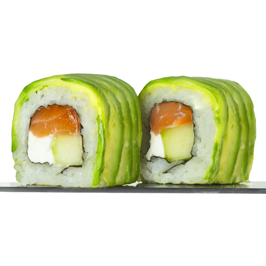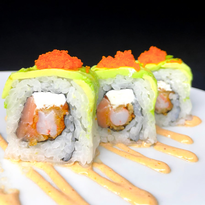 Apd: salmon fresco, pepino y queso crema. pf: cubierdo de aguacate salsa dulce